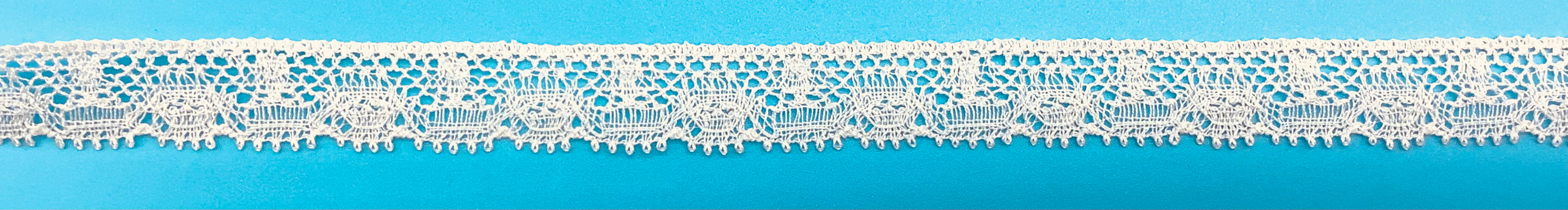 Style #: KB703-8Price Per Spool: $18.97Package Contains 10 Yards Hexagonal Mesh Ground Scalloped Edge with Picos Great for Children's Clothing, Handkerchief Edges, Doll Clothing & Heirloom Sewing