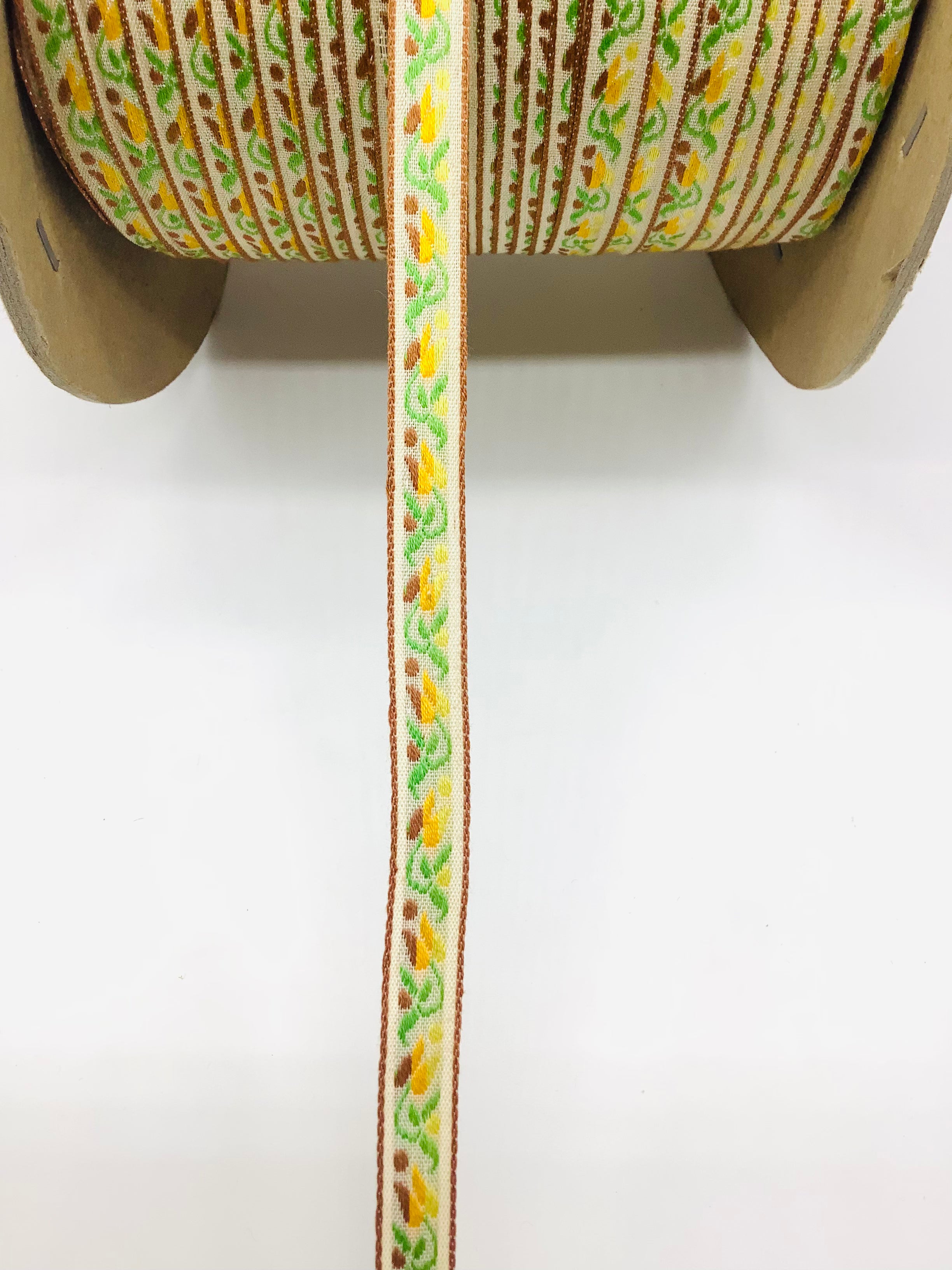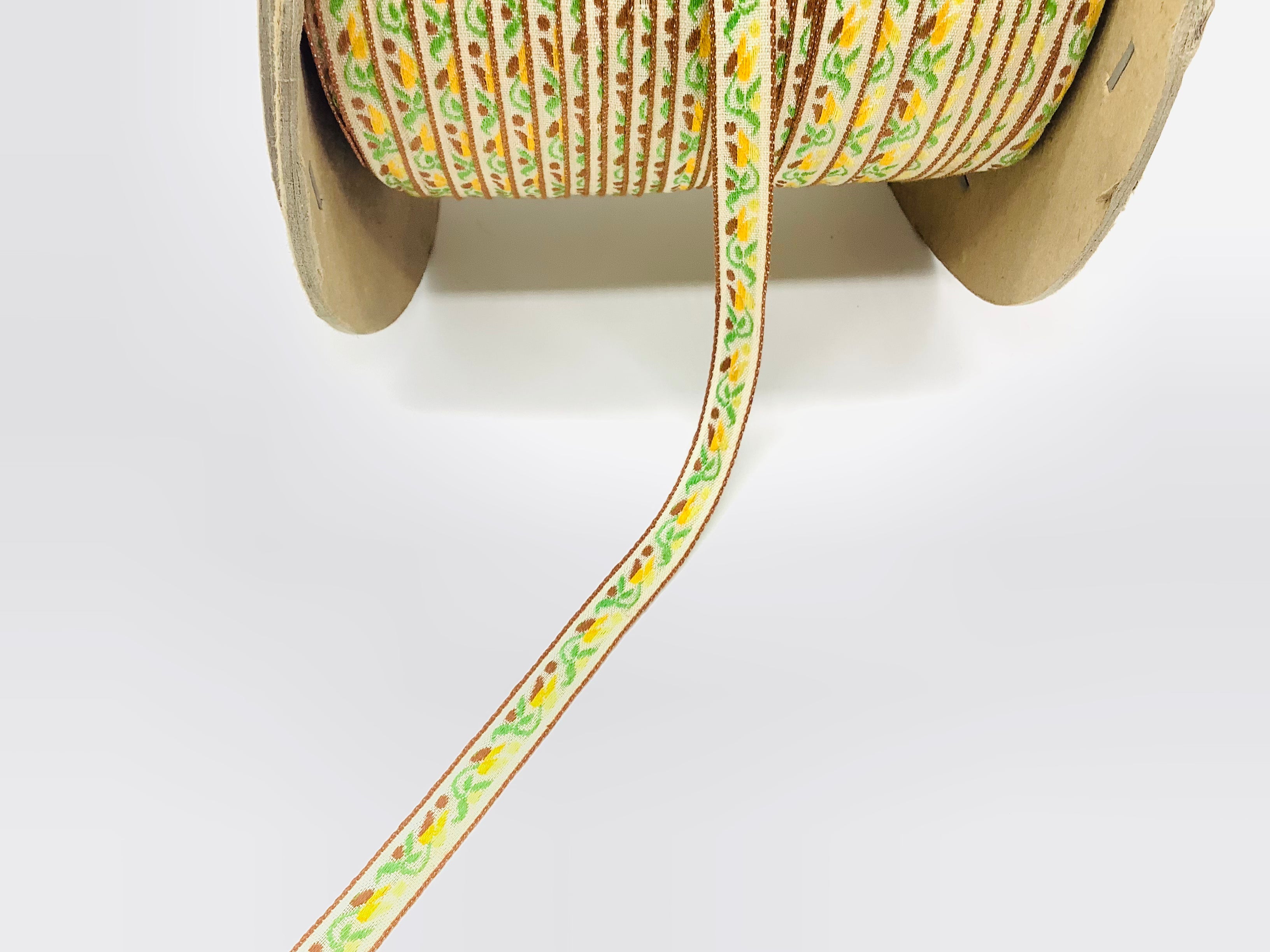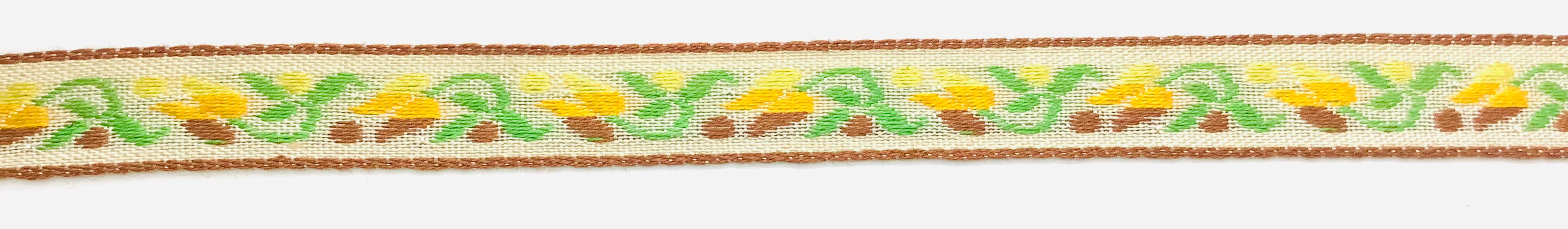 Lt. Brown, Lime & Yellow on Beige Background 7/16" Vintage Woven Tulip Jacquard - 12 Yards