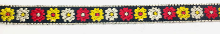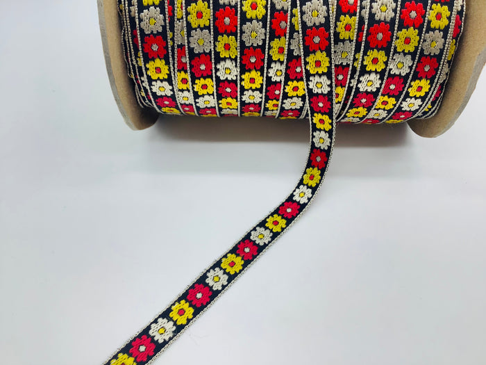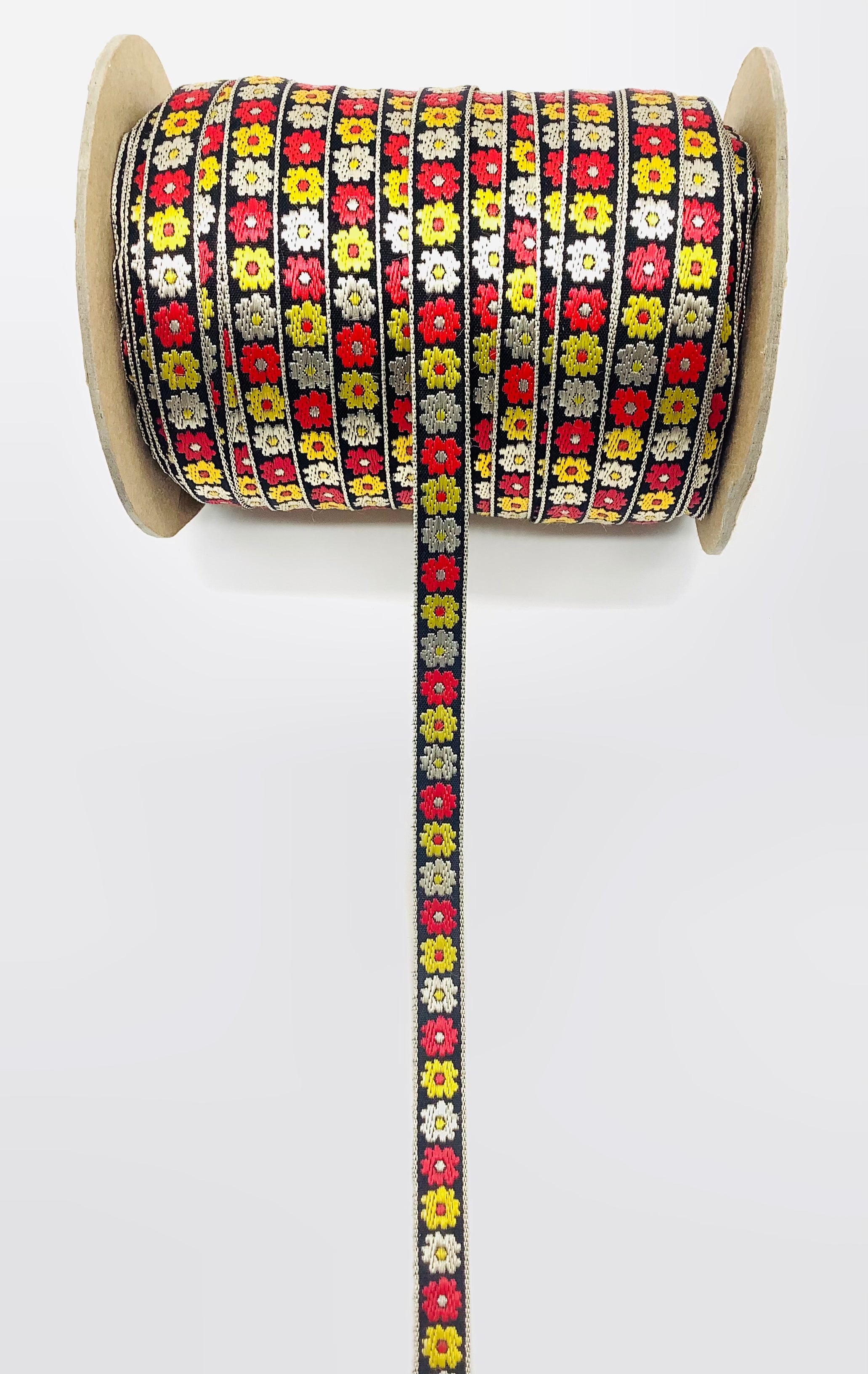 Red, Silver & Yellow on Black Background 1/2" Woven Jacquard - 10 Yards